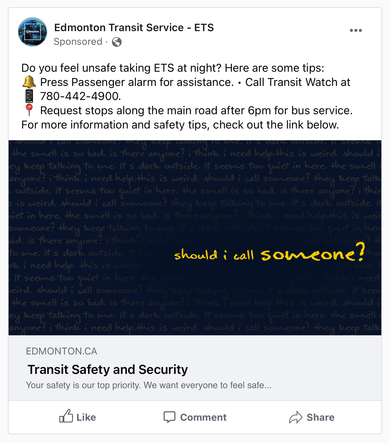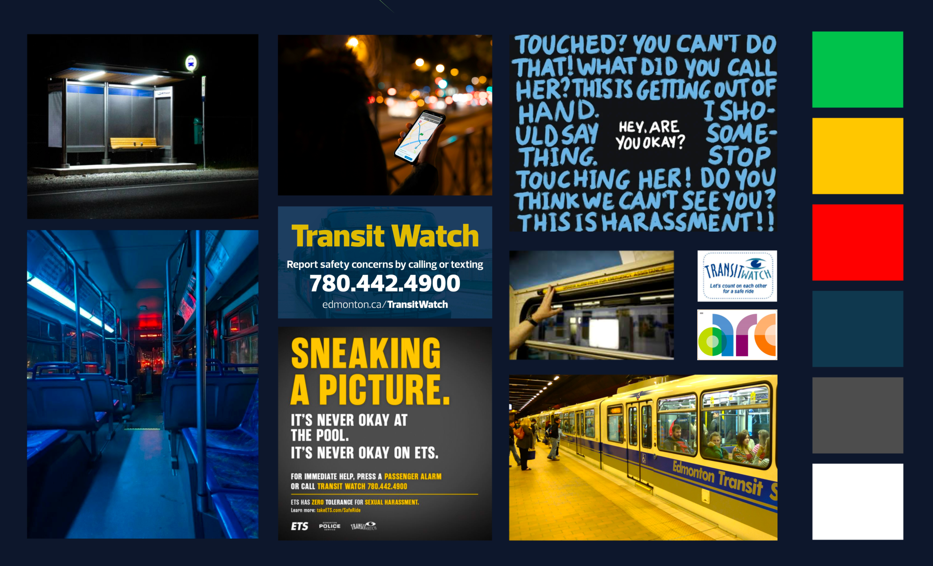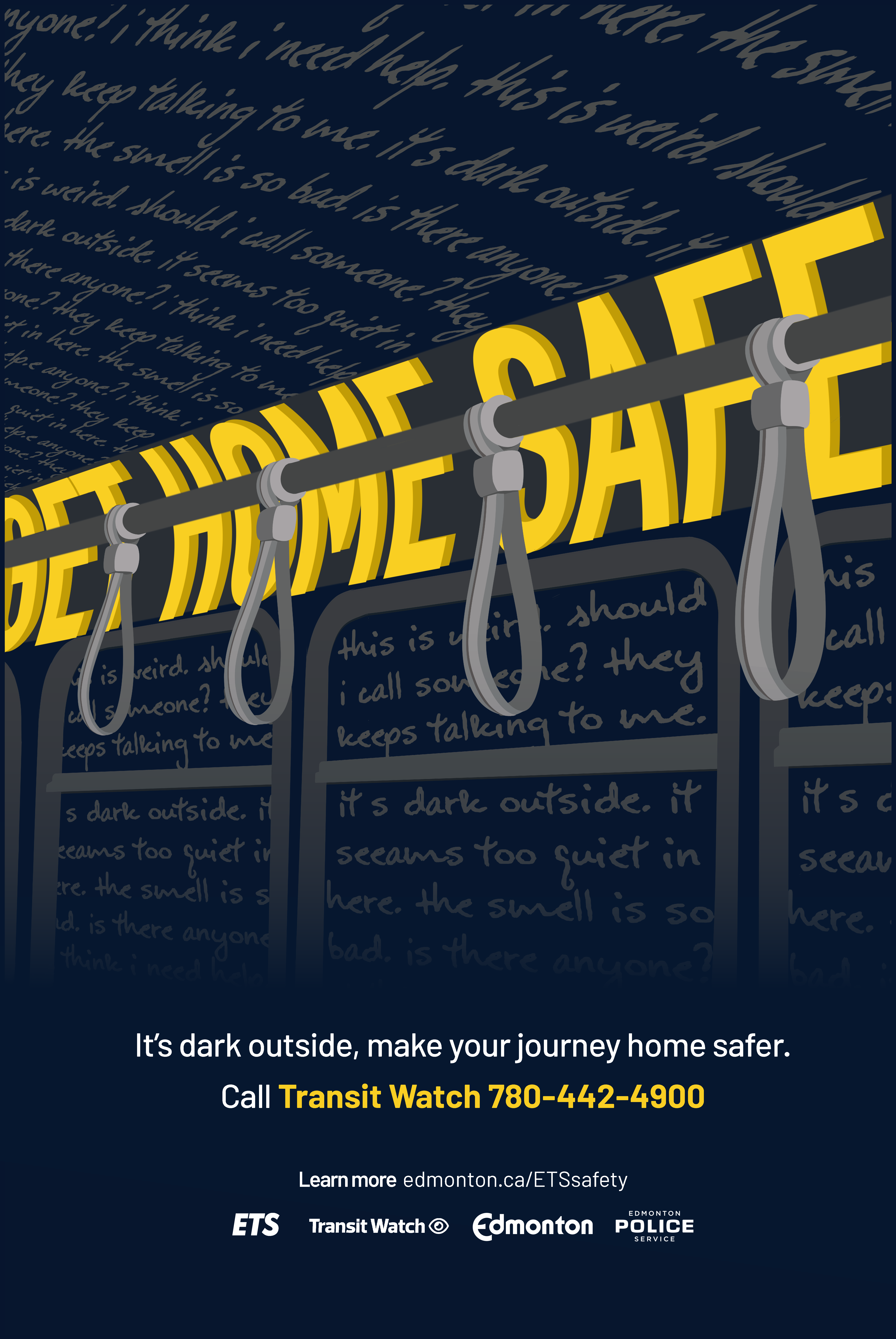 For this project, we are required to choose a topic and design a social campaign for it. The purpose of this project is for us to research and identify the problem, working on a visual medium to educate and change people's behaviour toward that issue. The topic I chose for this project is safety on public transit at night, specifically in the Edmonton area. I want to introduce some assistance and tools that ETS offers, and some actions that public transit riders can take to ensure their safety while travelling on the ETS. I utilized the high contrast of dark, cool-toned and bright, warm-toned colours to grab the audience's attention. The illustrative elements were objects related to the ETS system and the interior of a night train/bus in cool-toned colours to depict the night transit atmosphere.