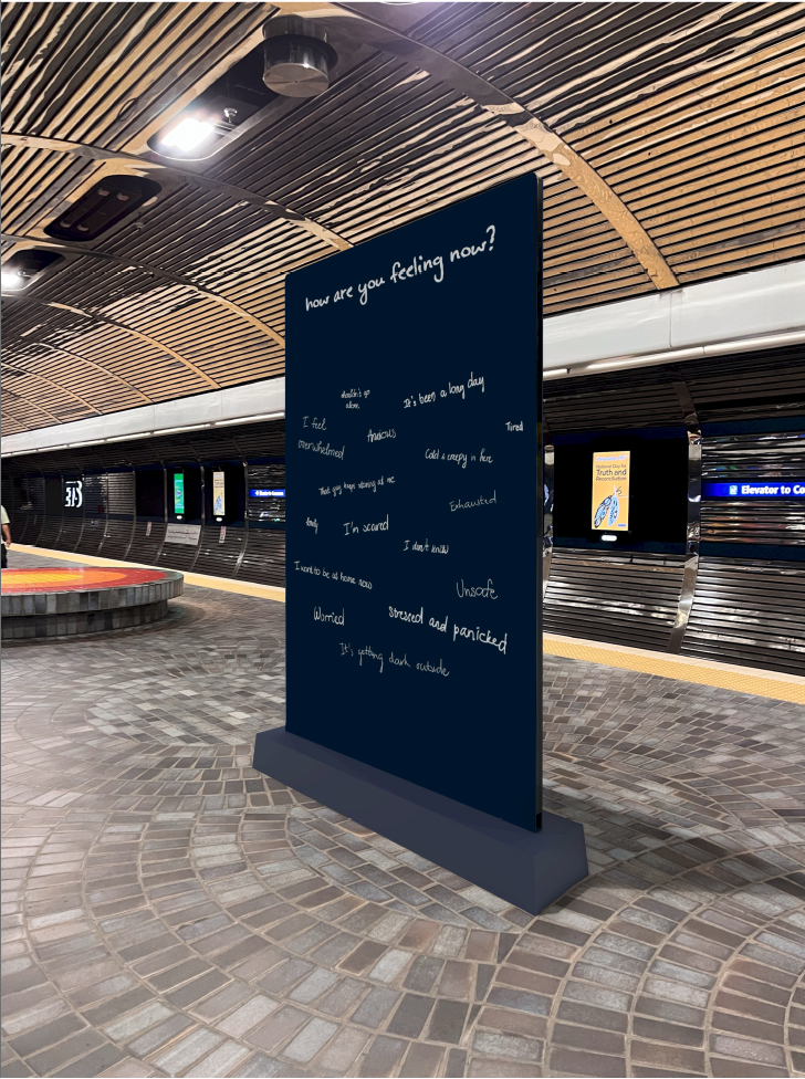 It was a challenging task to maintain a consistent visual language across the deliverables, but each part had to convey a different message. Since my chosen topic is related to the ETS system, I selected a colour scheme that aligns with their branding. It was also a challenge to make the design look aesthetic and relatable on a personal level, so the concept of inner thought and train interior space was introduced to evoke emotions from the audience. Overall, I think my public art installation has some room for improvement. It could have encouraged more interaction with the audience and been rendered better. I would try to experiment and redesign it in the near future.